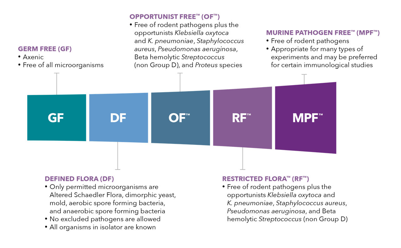Taconic Biosciences® has developed clear and harmonized health standards to meet specific research requirements. Our health standards are defined by exclusion lists, husbandry practices, and testing methods and frequency. The standards can be grouped into barrier standards (with exclusion lists) and gnotobiotic isolator standards (in which all organisms in a location are known). A core list of rodent pathogens is excluded from all Taconic health standards. These health standards range from the most stringent health standard, Taconic germ-free (GF), to Taconic murine pathogen-free (MPF) where a select list of opportunistic bacteria are tolerated.