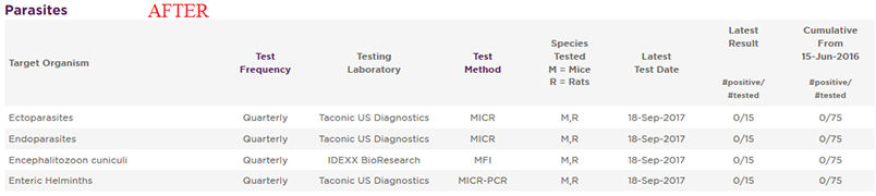 Taconic is rolling out changes to how parasites are reported on its animal health reports. Taconic continues to exclude all parasites at all health standards. That won't change. We will continue to exclude all parasites and test using a range of diagnostic methods, including microscopy, flotation, MFI and PCR. We are changing the way we report parasites on the health report. Taconic currently reports a defined listed of 16 parasites. This might falsely give the impression that we only exclude those parasites, when in fact Taconic excludes all parasites. We will now report parasites on our health reports under broad classes: endoparasites, ectoparasites and enteric helminths. We will continue to report one specifically named agent, Encephalitozoon cuniculi, which is of particular concern to those customers who also house rabbits. Below is an example of the relevant health report section, shown as before and after.